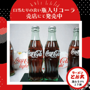 シュワっとひんやり一休みしませんか? いつも当店をご利用いただき、ありがとうございます。 蓮台寺PAラーメンとん太です。 本日は昔懐かしい瓶入りコーラのご紹介です。 口当たりの良い瓶入りコーラ売店にて発売中です。 楽しいドライブのお供にいかがでしょうか? お買い上げの際は、レジにて瓶のフタは開封いたします。 ご来店の際はぜひ是非チェックしてみてください。 スタッフ一同、ご来店をお待ちしております。
