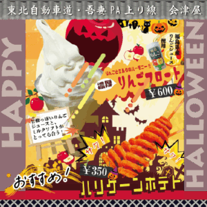 吾妻PA上り線 会津屋 おすすめ!「濃厚りんごフロート」 「濃厚りんごフロート」福島県産のりんごを使用したジュースと濃厚なミルクソフトの味わいがベストマッチな一品です! 「ハリケーンポテト」揚げたてサクサクの食感とポテトのホクホク感がたまらない一品です!